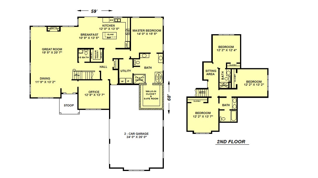 A large open Great Room, Dining Area and Kitchen featuring 10′ ceilings give this house a feeling of spaciousness. A private Office is conveniently located just inside the Entry for those who work at home. The Kitchen features plenty of cabinets plus an island and a Walk-In Pantry. The Master Suite includes a roomy Bath with 2 vanities, a Tile Shower and a Garden Tub. The reinforced concrete Walk-in Closet doubles as a Safe Room. The Laundry is accessible directly from the Bath.